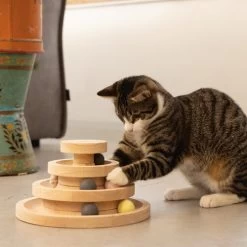 Mia ist das perfekte Katzenspielzeug fĂŒr Katzen, die gerne alleine oder zusammen spielen. Dieser Spielturm besteht aus nicht weniger als drei Etagen, einschlieĂlich BĂ€llen. Ihre Katze muss nur einen der BĂ€lle mit ihrer Schnauze oder ihrer Pfote berĂŒhren. Die BĂ€lle rollen dann in alle Richtungen und bieten Ihrer Katze eine weitere BeschĂ€ftigung. Aufgrund der natĂŒrlichen Farbtöne dieses Spielzeugs passt es problemlos in jede Einrichtung.