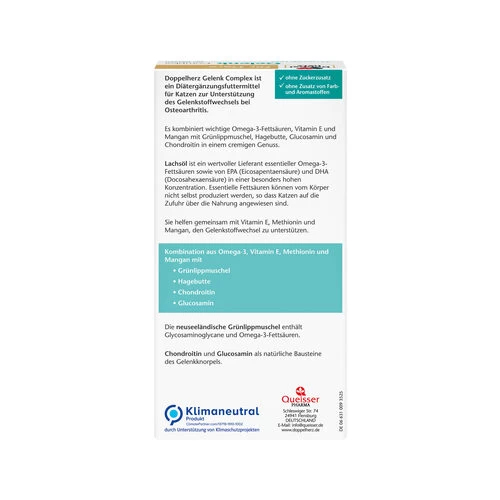 Benötigt Ihre Katze Unterstützung für ihre Gelenke? Doppelherz Gelenk Complex für Katzen ist ein innovatives und wirksames Diätergänzungsfuttermittel. Es kombiniert wertvolle, natürliche Inhaltsstoffe zur Unterstützung des Gelenkstoffwechsels bei Osteoarthrose. Mit Omega-3-Fettsäuren, Vitamin E, Grünlippmuschel, Hagebutte, Glucosamin + Chondroitin. Die Verabreichung ist einfach, da nur ein Portionsbeutel pro Tag genügt.