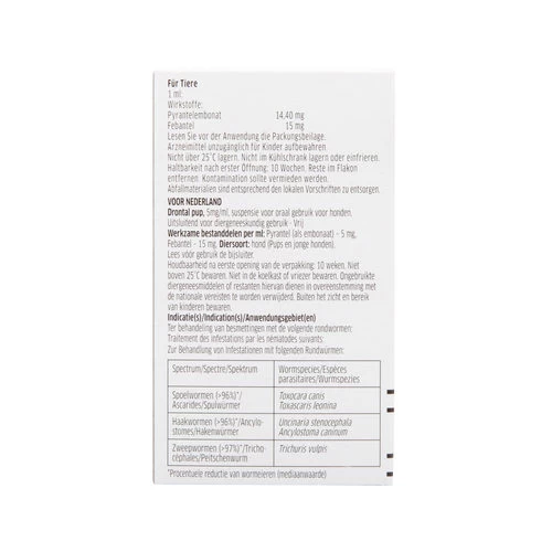 1 ml Drontal Pup pro kg Körpergewicht, direkt verabreichen oder unters Futter mischen. 1 ml Drontal Pup entspricht 15 mg Febantel und 14,4 mg Pyrantelembonat pro kg Körpergewicht.