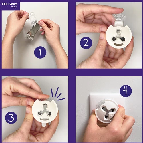 Ăffnen Sie die Verpackung der Kartusche und legen Sie sie in den speziellen Verdampfer. SchlieĂen Sie dann den Verdampfer an das Stromnetz an. Tun Sie dies in dem Zimmer, in dem sich Ihre Katze die meiste Zeit aufhĂ€lt. Achten Sie darauf, dass der Verdampfer frei hĂ€ngt. Stellen Sie es nicht unter Regale oder hinter VorhĂ€nge, Möbel und TĂŒren.