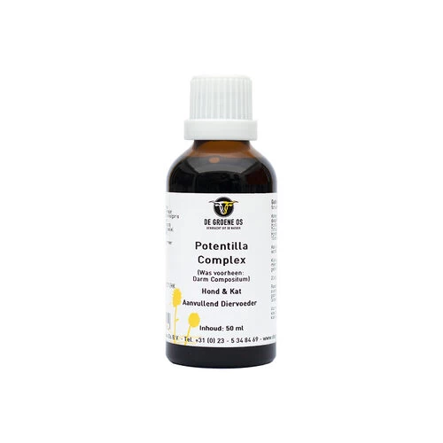 Groene Os Potentilla Complex ist ein ErgĂ€nzungsfuttermittel fĂŒr Hunde und Katzen und trĂ€gt zur normalen Darmfunktion bei. Es fördert eine regelmĂ€Ăige Stuhlentleerung und eine gesunde Darmfunktion und Verdauung.